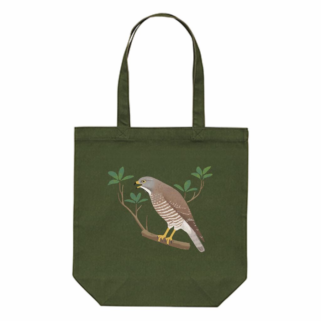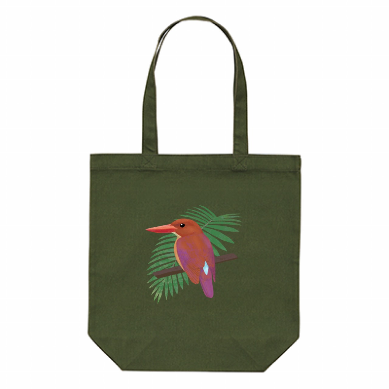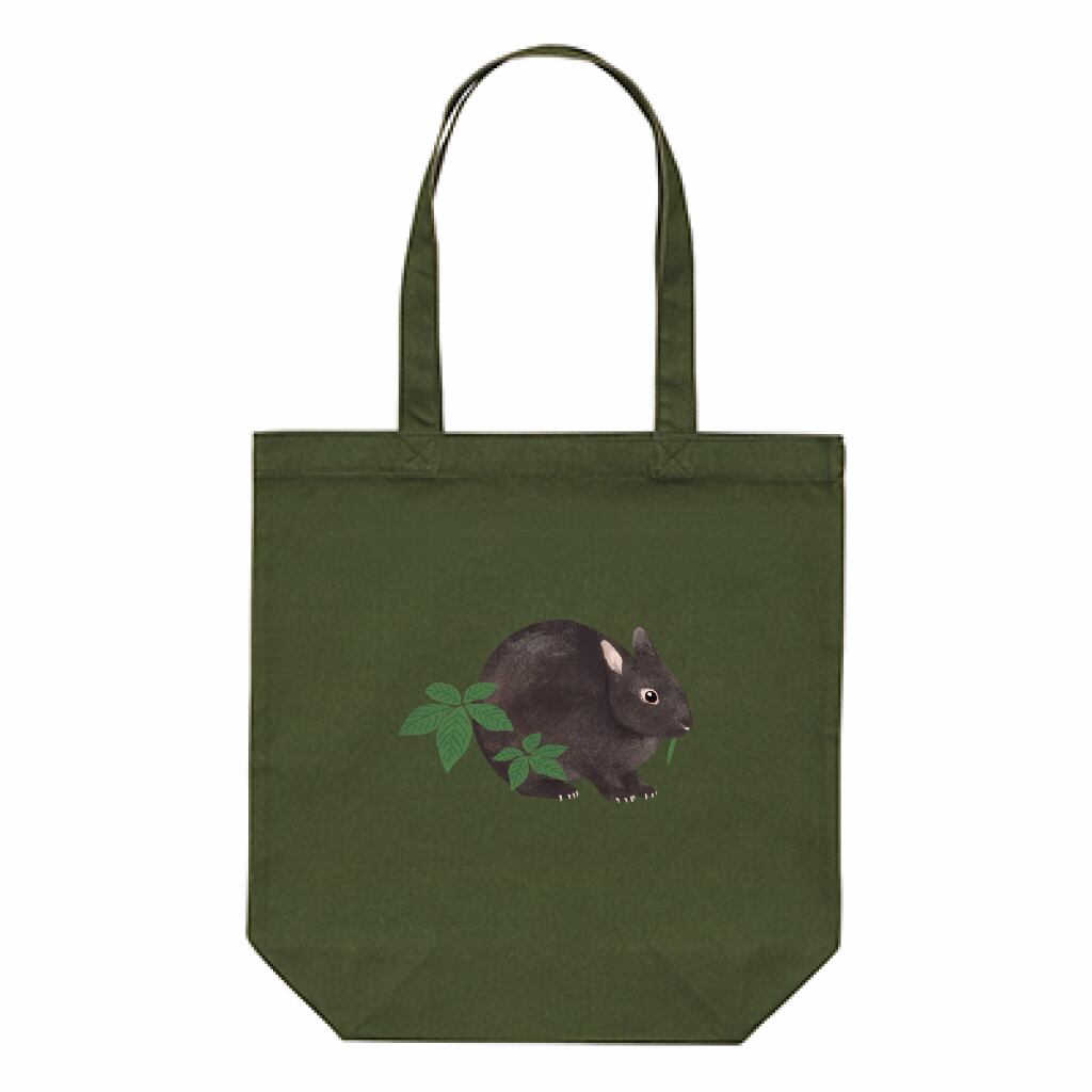 イラストにマッチしたモスグリーンの生地。サイズは使いやすいA4トートバッグ仕様で、日常使いにぴったりです。